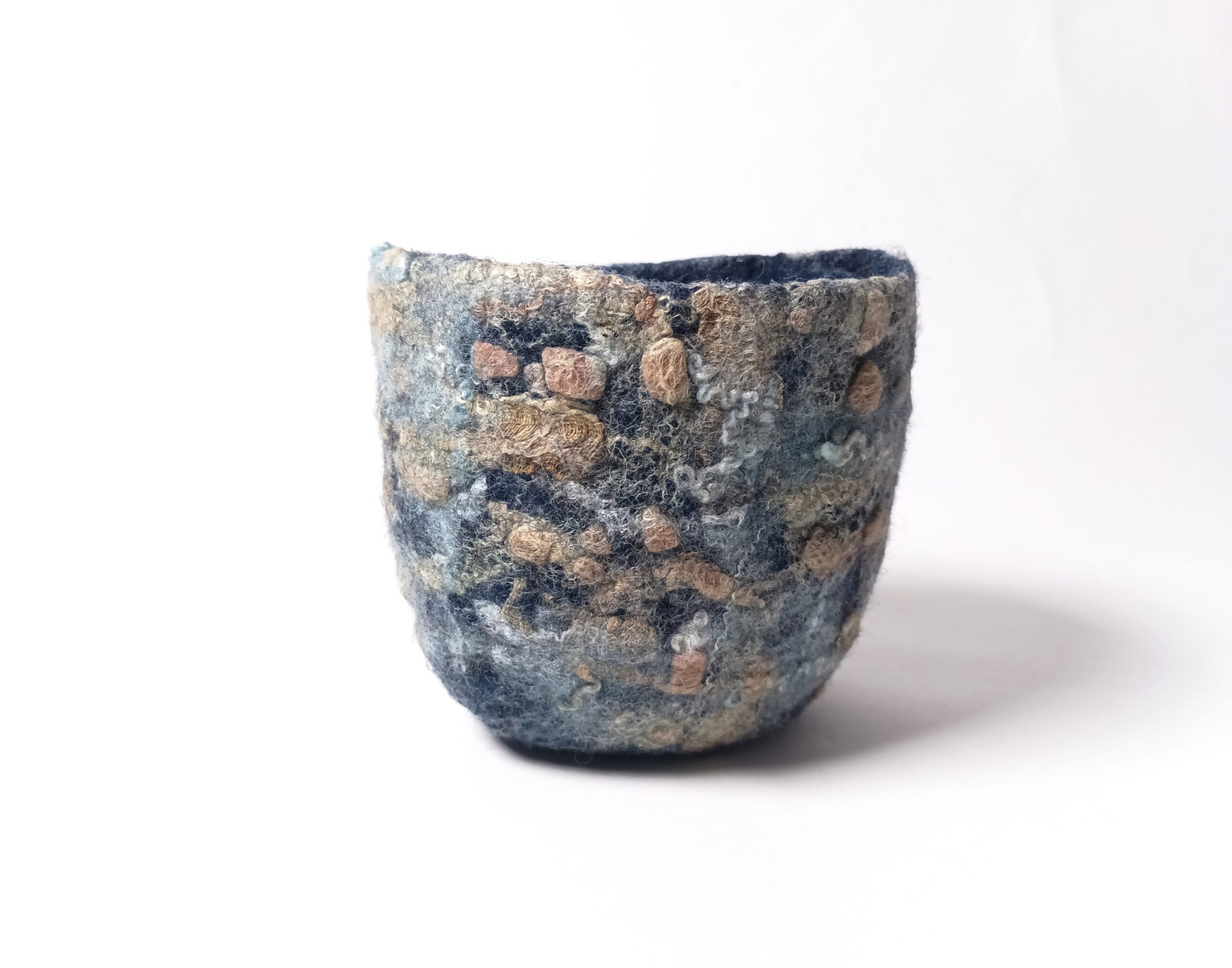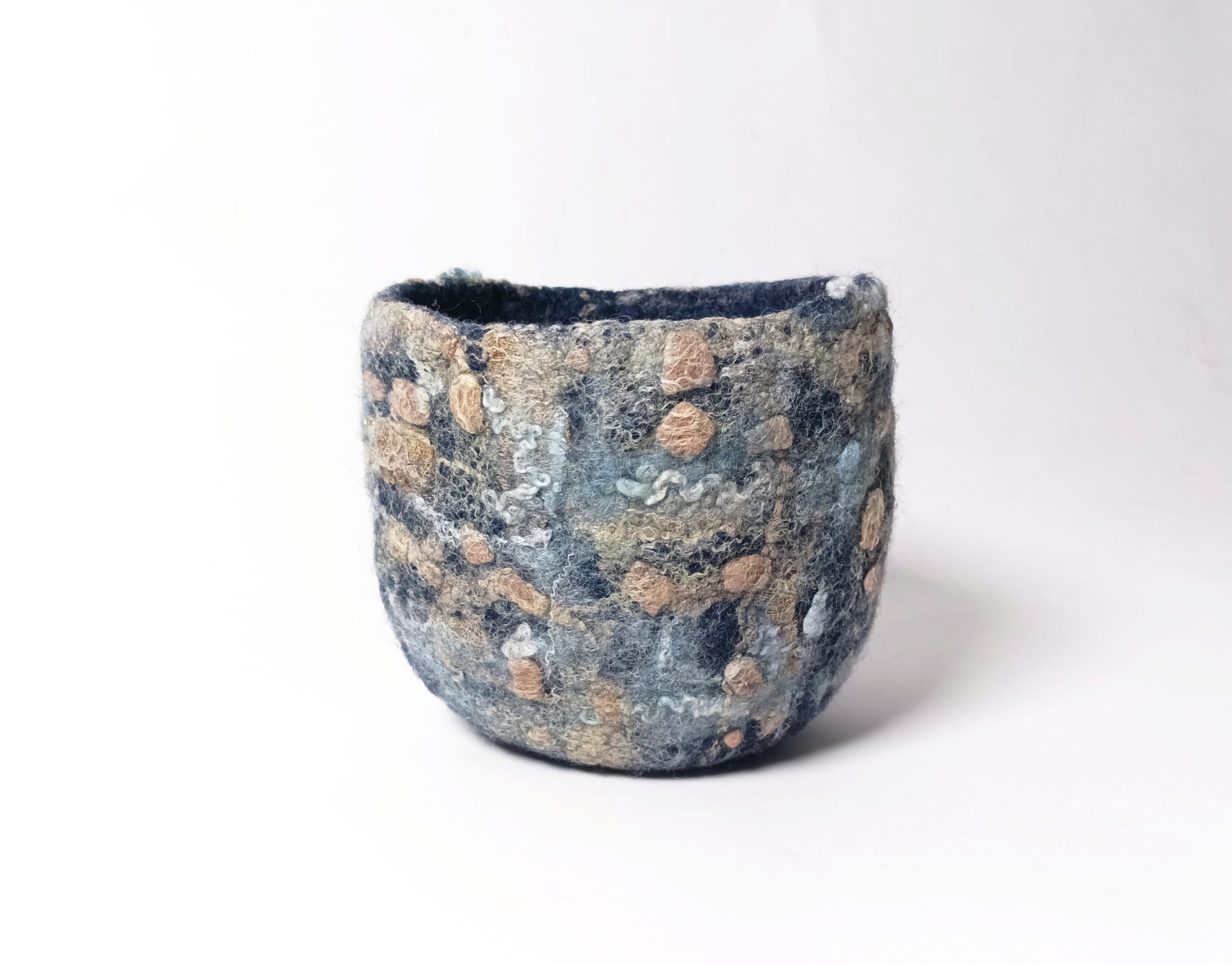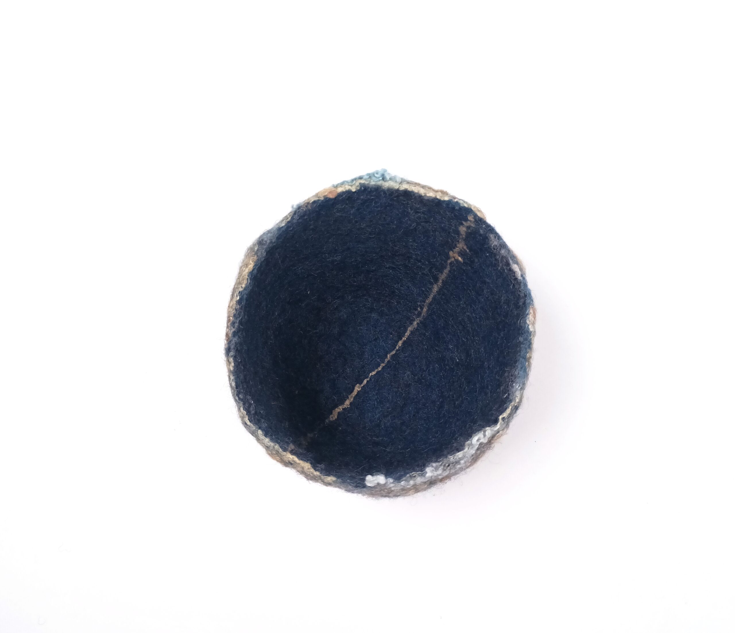 Dans la série de contenants aux textures et motifs originaux voici un bol ou petite corbeille. Il est en feutre de laine teint à l’indigo naturel, qui donne des variations subtiles de tons bleutés. Le décor a été créé grâce à l’ajout de fibres de soie que j’ai teintes avec des plantes. Cela en fait un objet au design totalement éco -responsable, puisque sa fabrication n’a employé ni machine ni substance artificielle ou nocive.