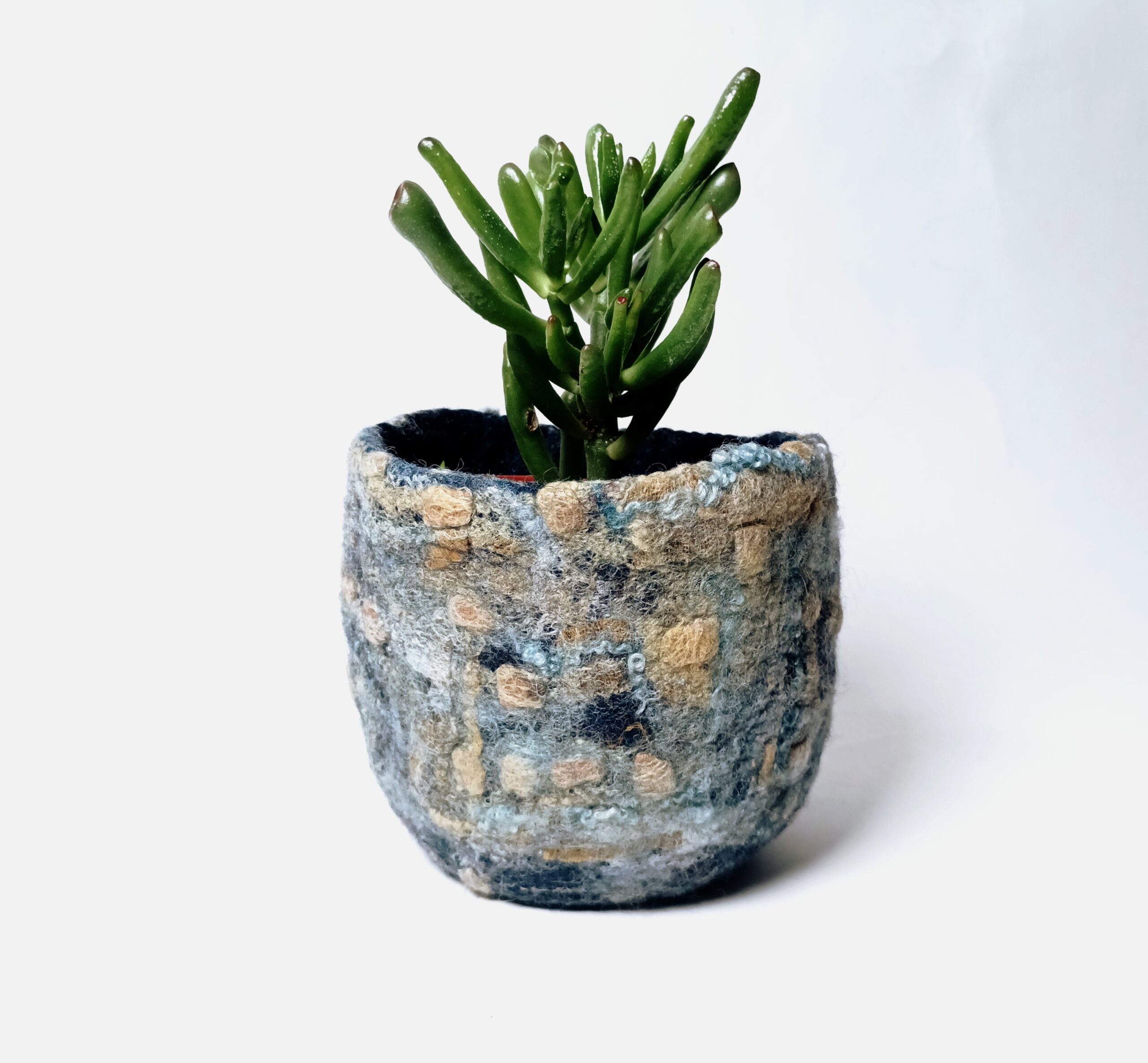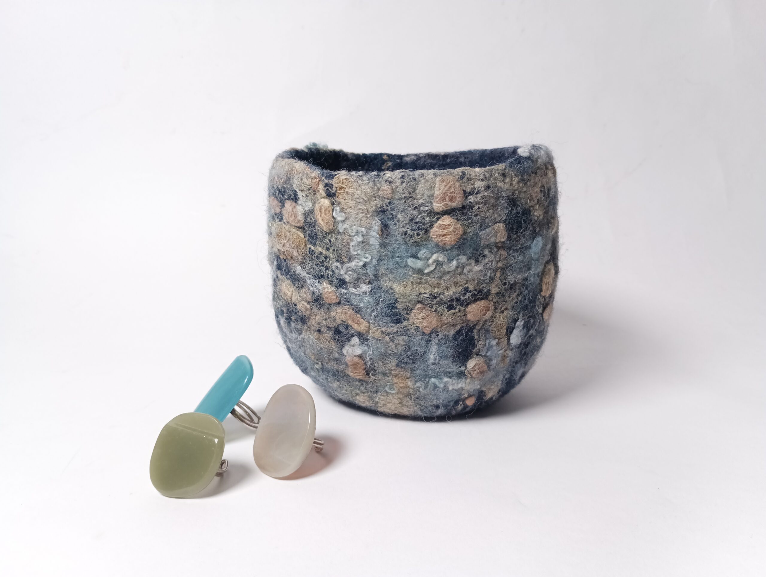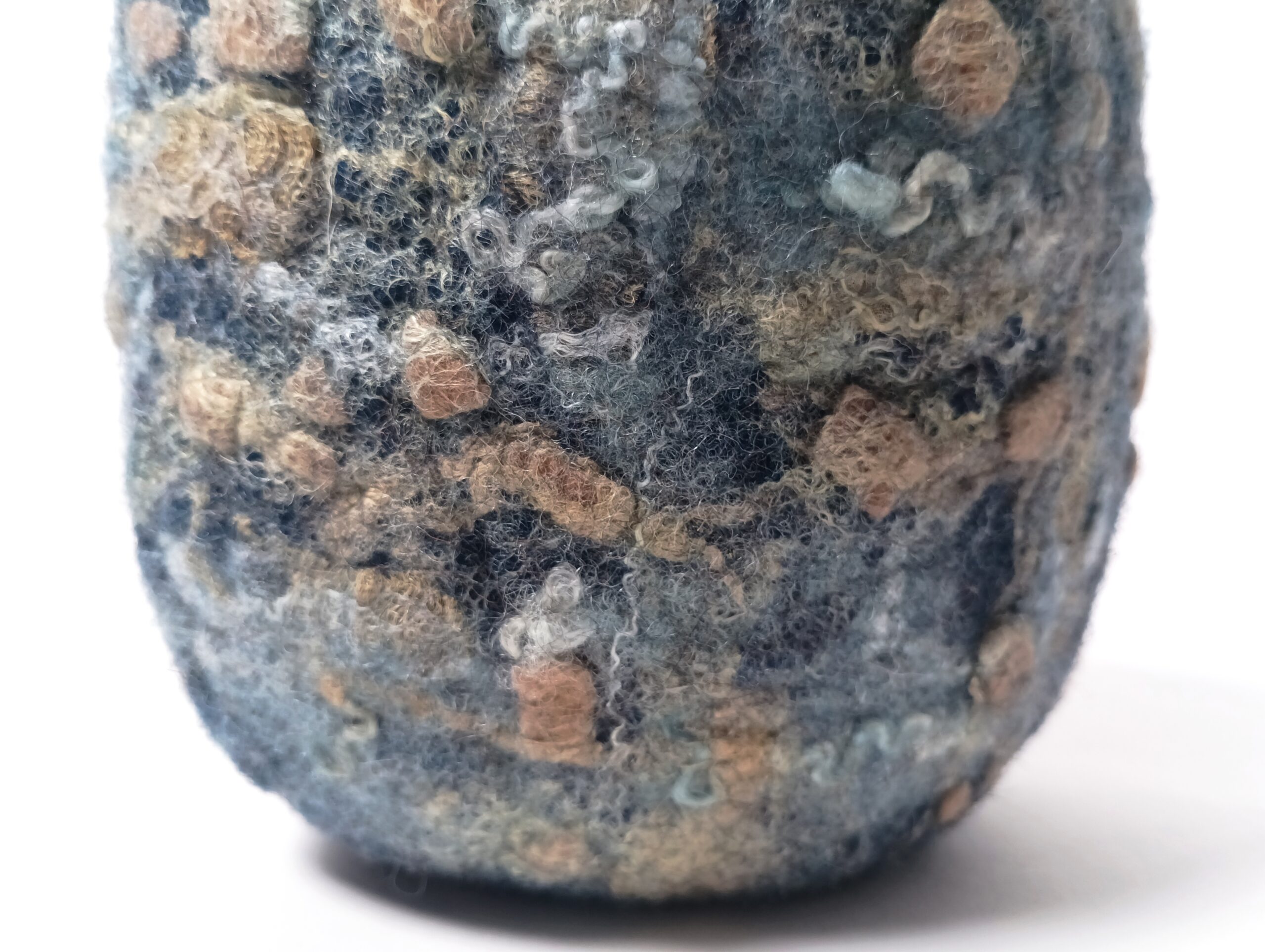 Dans la série de contenants aux textures et motifs originaux voici un bol ou petite corbeille. Il est en feutre de laine teint à l’indigo naturel, qui donne des variations subtiles de tons bleutés. Le décor a été créé grâce à l’ajout de fibres de soie que j’ai teintes avec des plantes. Cela en fait un objet au design totalement éco -responsable, puisque sa fabrication n’a employé ni machine ni substance artificielle ou nocive.