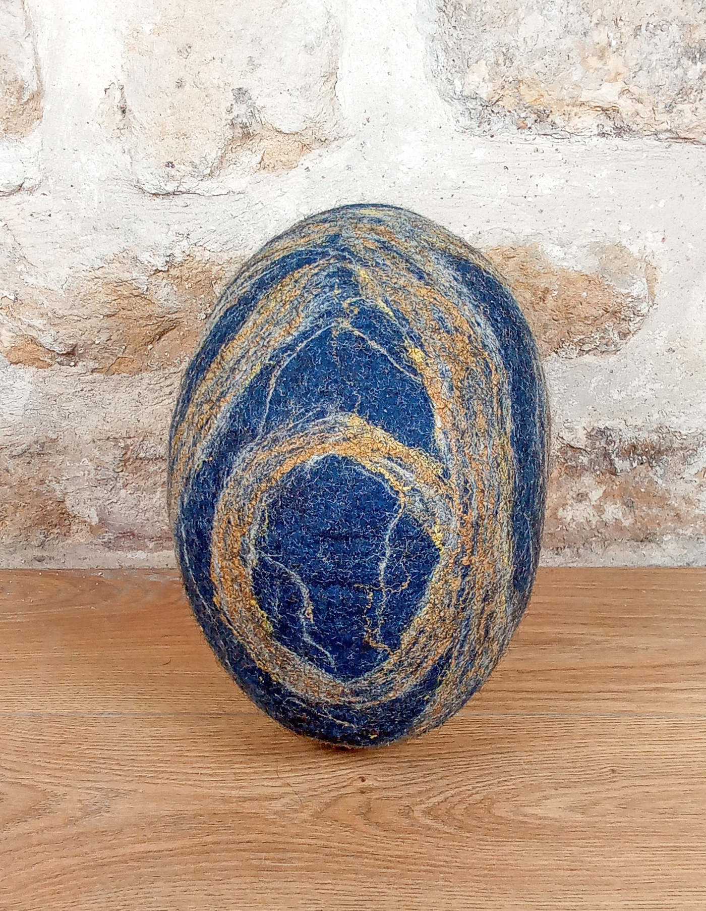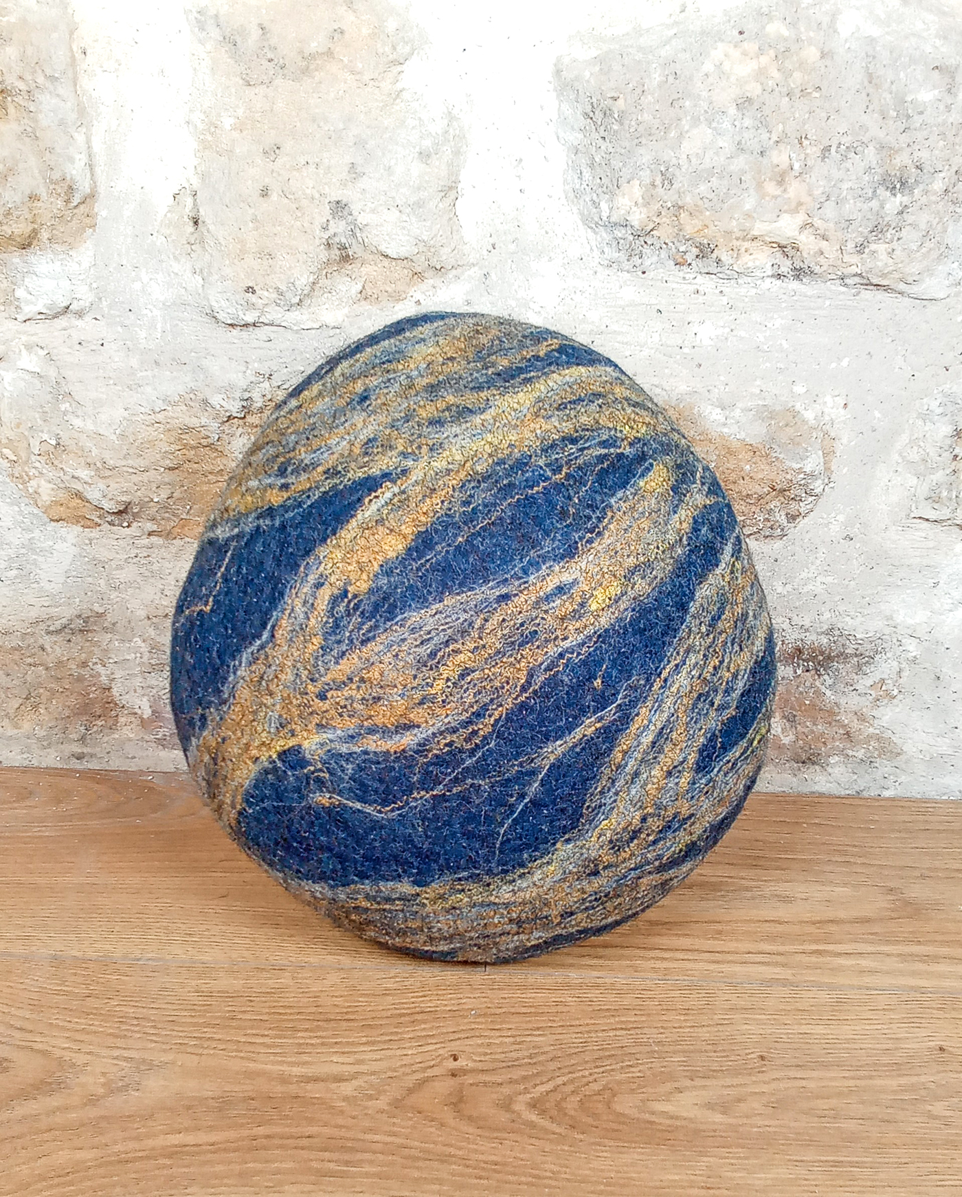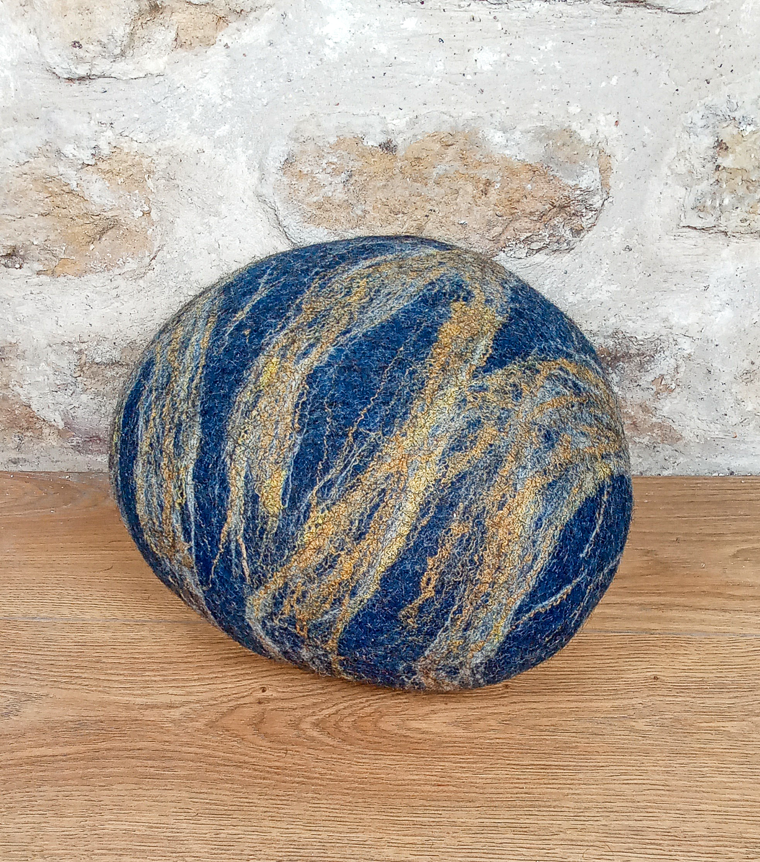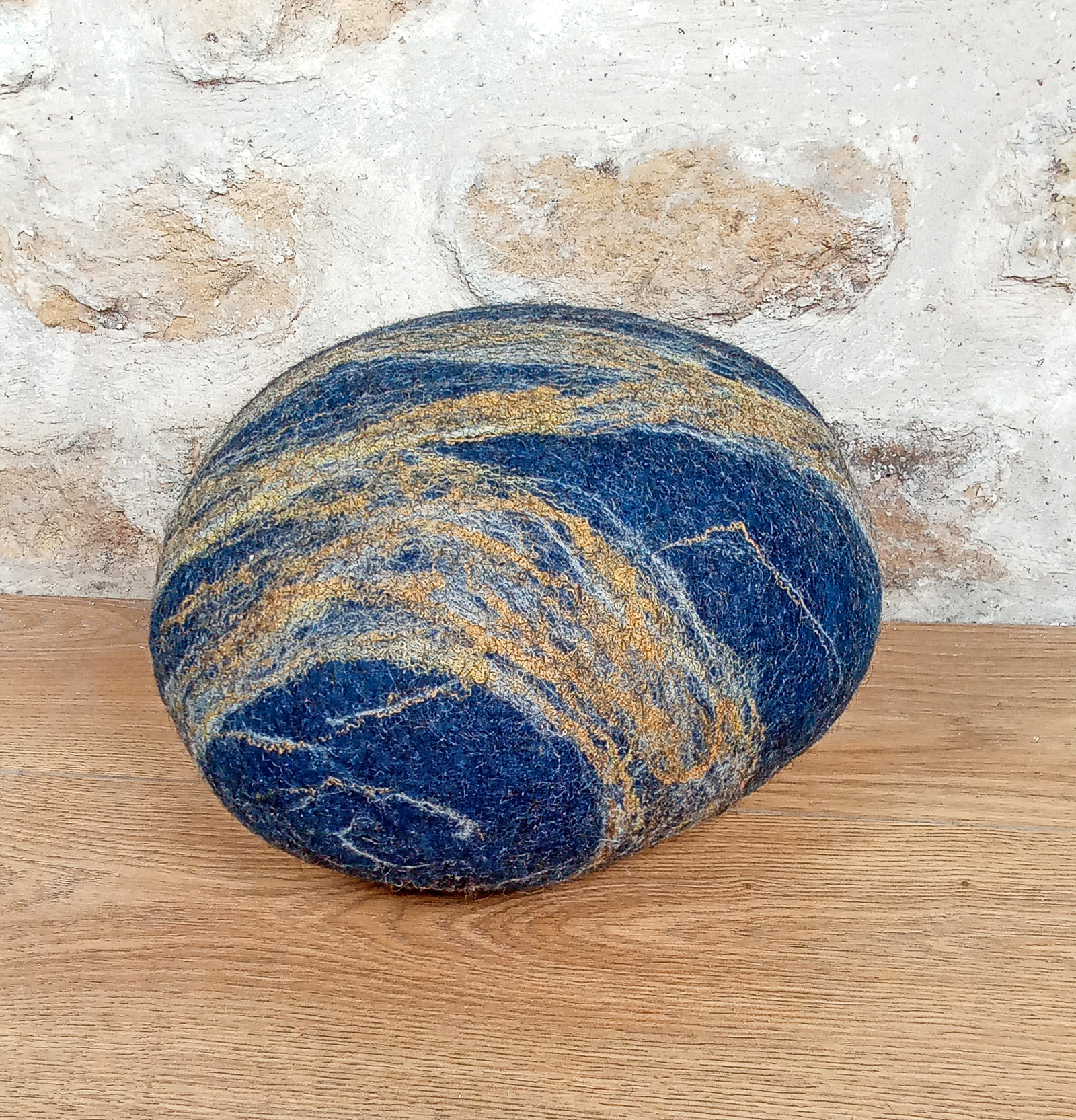 Voici un coussin décoratif en feutre de laine de Mérinos,en forme de galet, aux coloris bleu indigo et mordoré. Ici la version en taille moyenne de ce coussin original. Les motifs de volutes marbrées ont été réalisés grâce à de la laine de Mérinos : cette laine fine et douce a été teinte avec de l’indigo naturel. Elle est rehaussée de fibres de soie mordorées qui parcourent élégamment toute sa surface, comme des veines qui parcourent les galets. Chaque coussin est unique, avec son décor et sa forme propres.