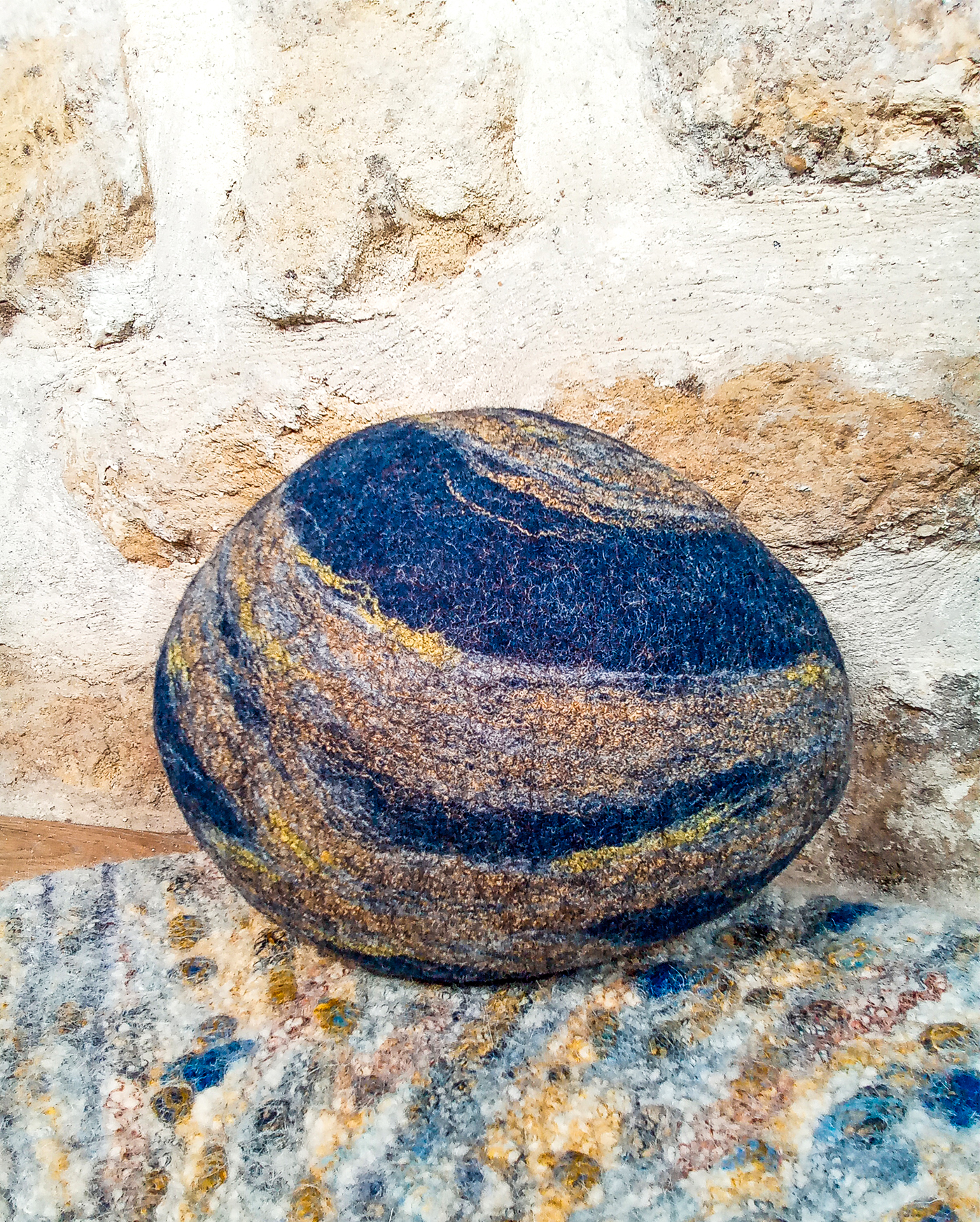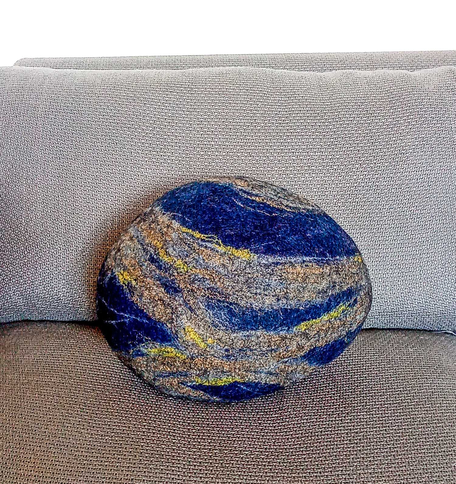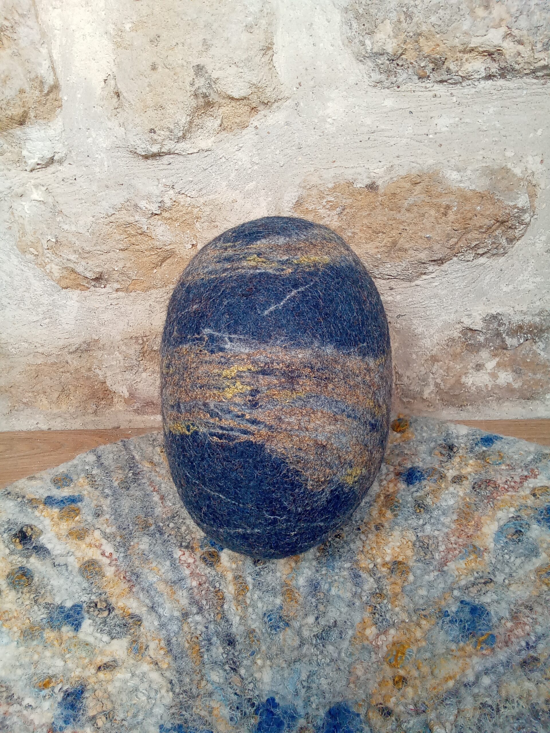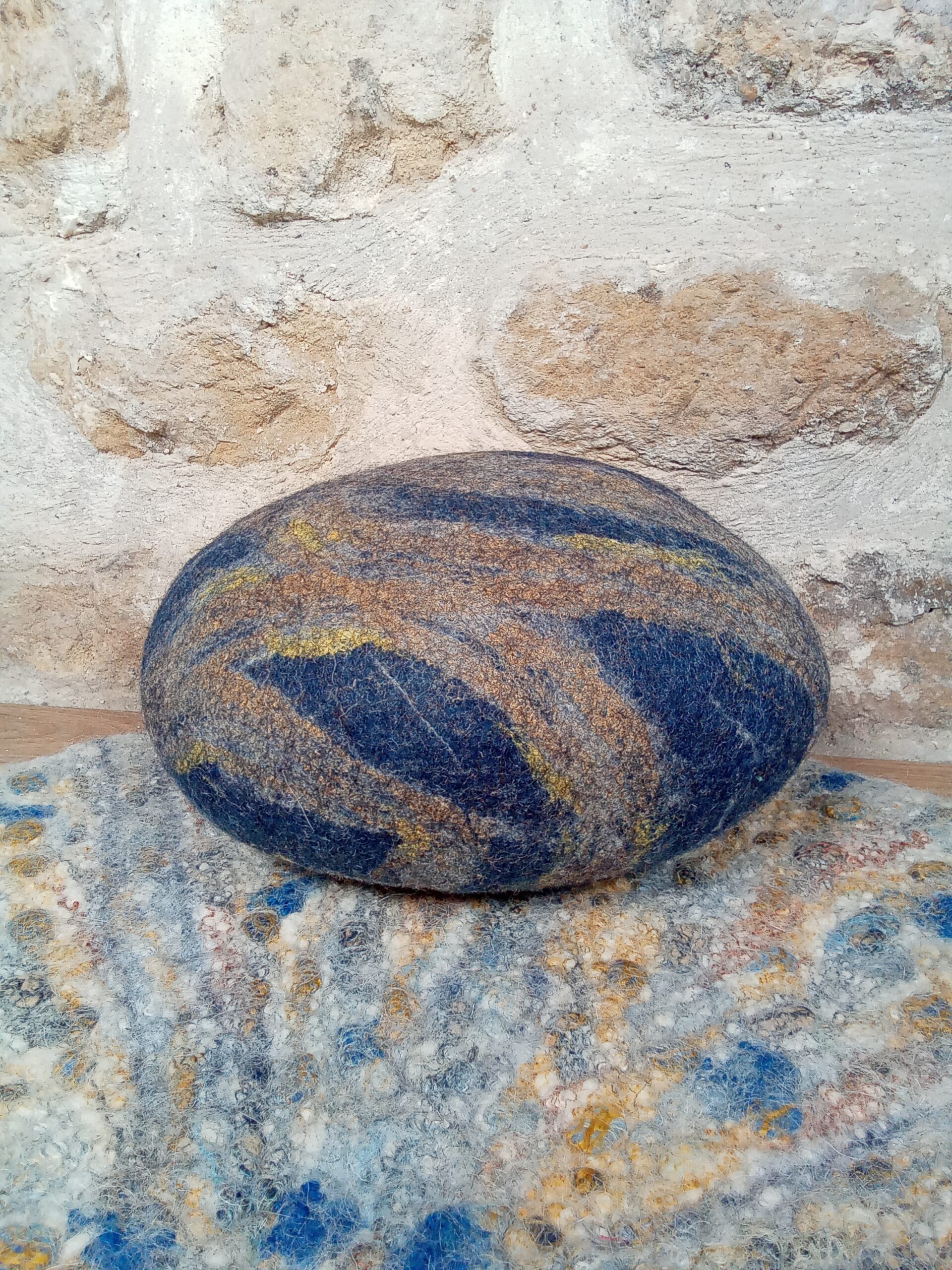 Voici un petit coussin décoratif en feutre de laine de Mérinos,en forme de galet, aux coloris bleu indigo et mordoré. Les motifs de volutes marbrées ont été réalisés grâce à de la laine de Mérinos : cette laine fine et douce a été teinte avec de l’indigo naturel. Elle est rehaussée de fibres de soie mordorées qui parcourent élégamment toute sa surface, comme des veines qui parcourent les galets. Chaque coussin est unique, avec son décor et sa forme propres.