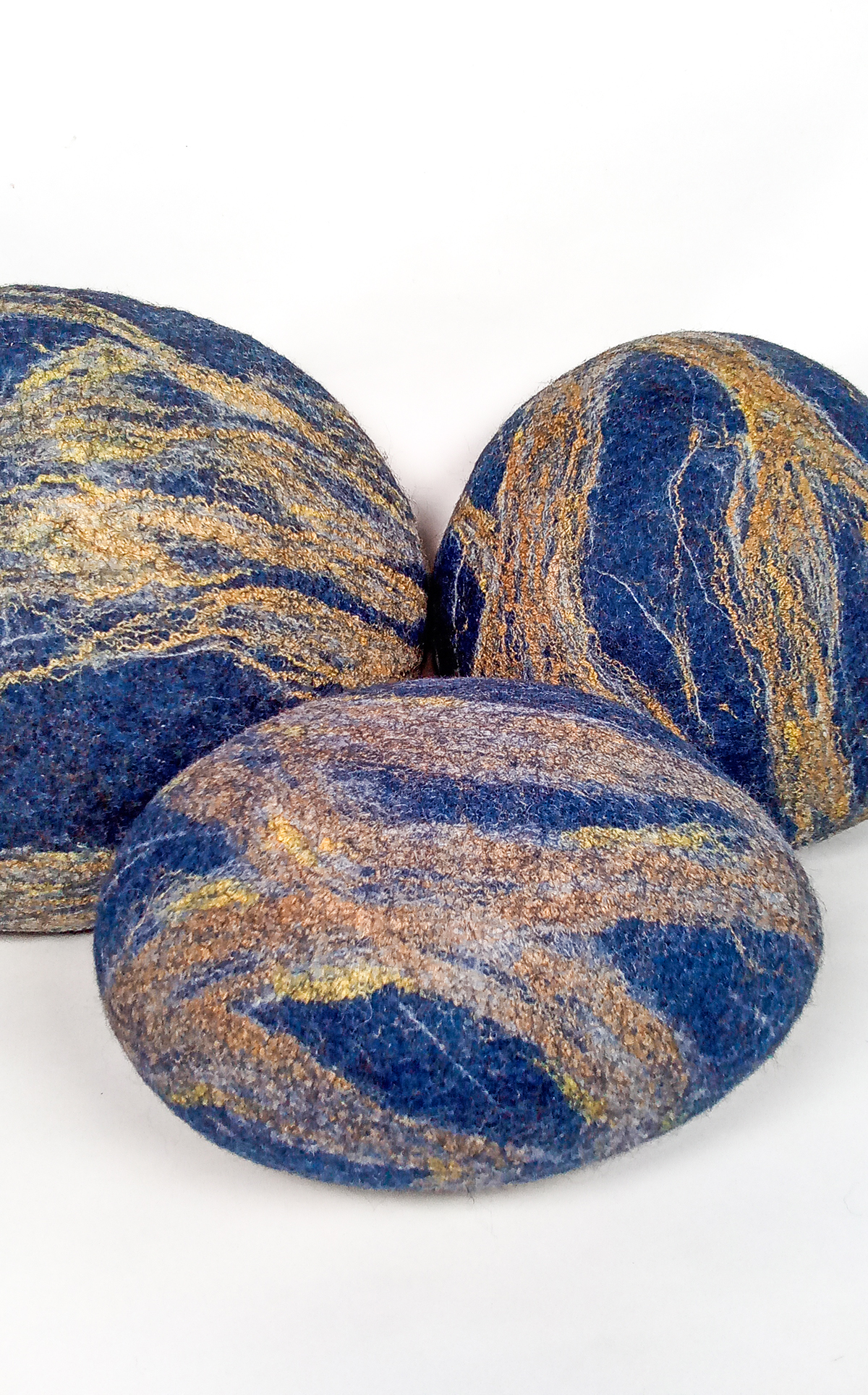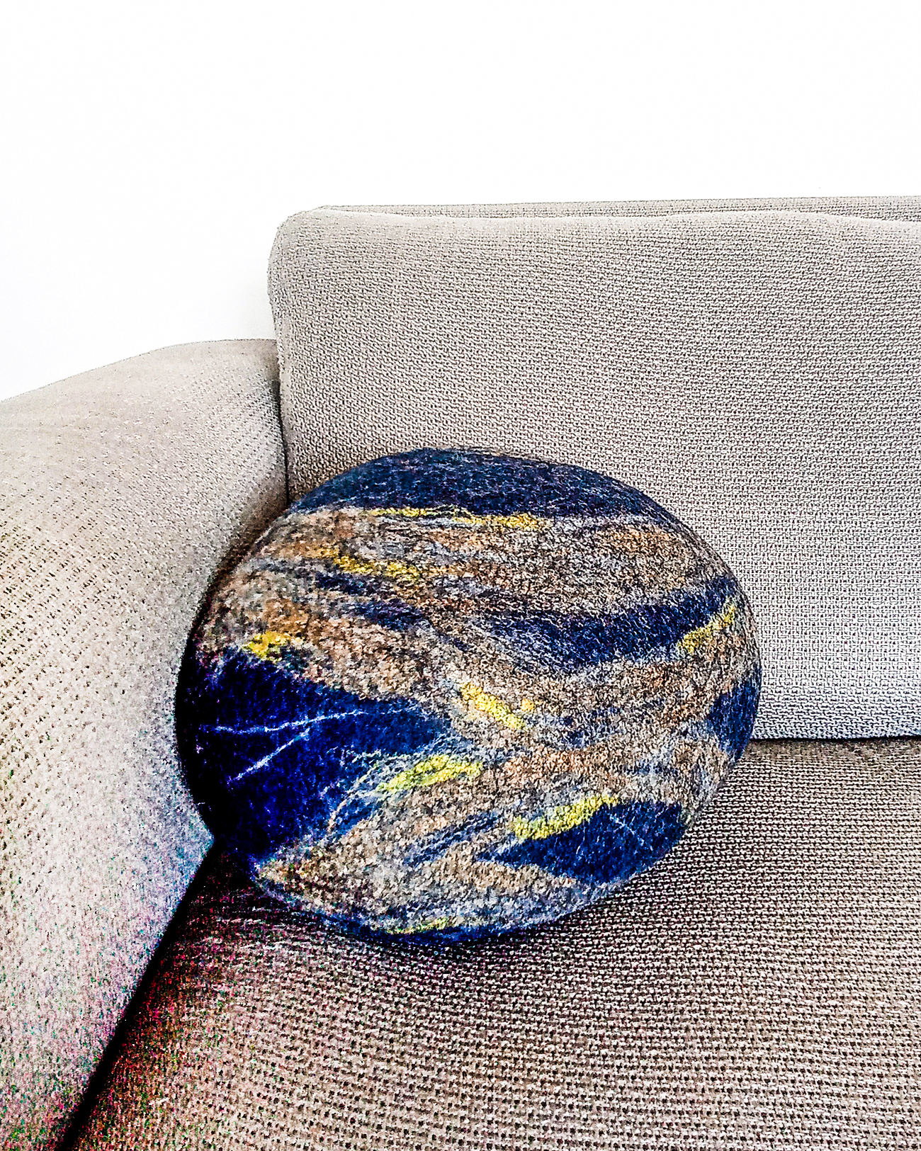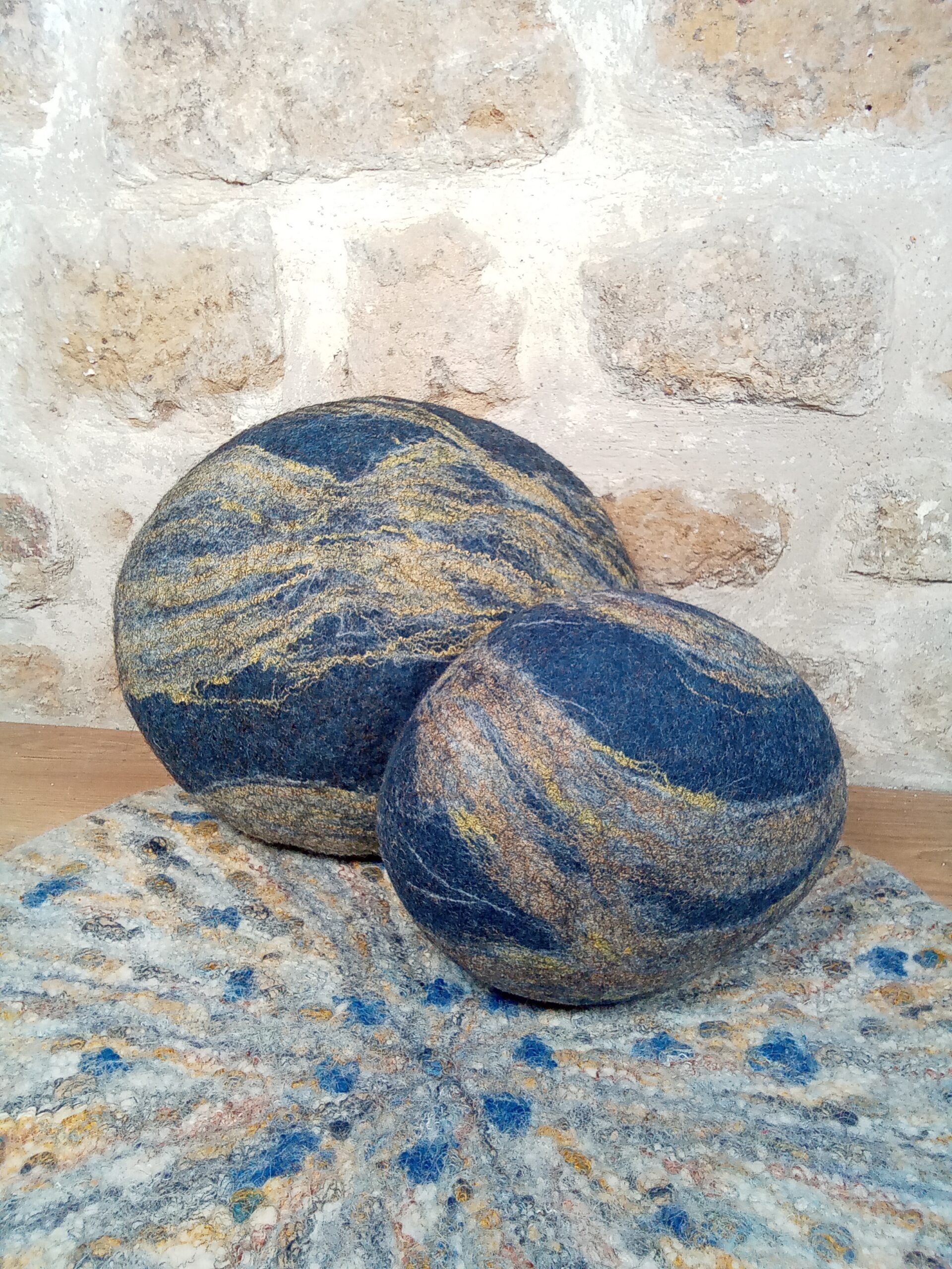 Voici un petit coussin décoratif en feutre de laine de Mérinos,en forme de galet, aux coloris bleu indigo et mordoré. Les motifs de volutes marbrées ont été réalisés grâce à de la laine de Mérinos : cette laine fine et douce a été teinte avec de l’indigo naturel. Elle est rehaussée de fibres de soie mordorées qui parcourent élégamment toute sa surface, comme des veines qui parcourent les galets. Chaque coussin est unique, avec son décor et sa forme propres.