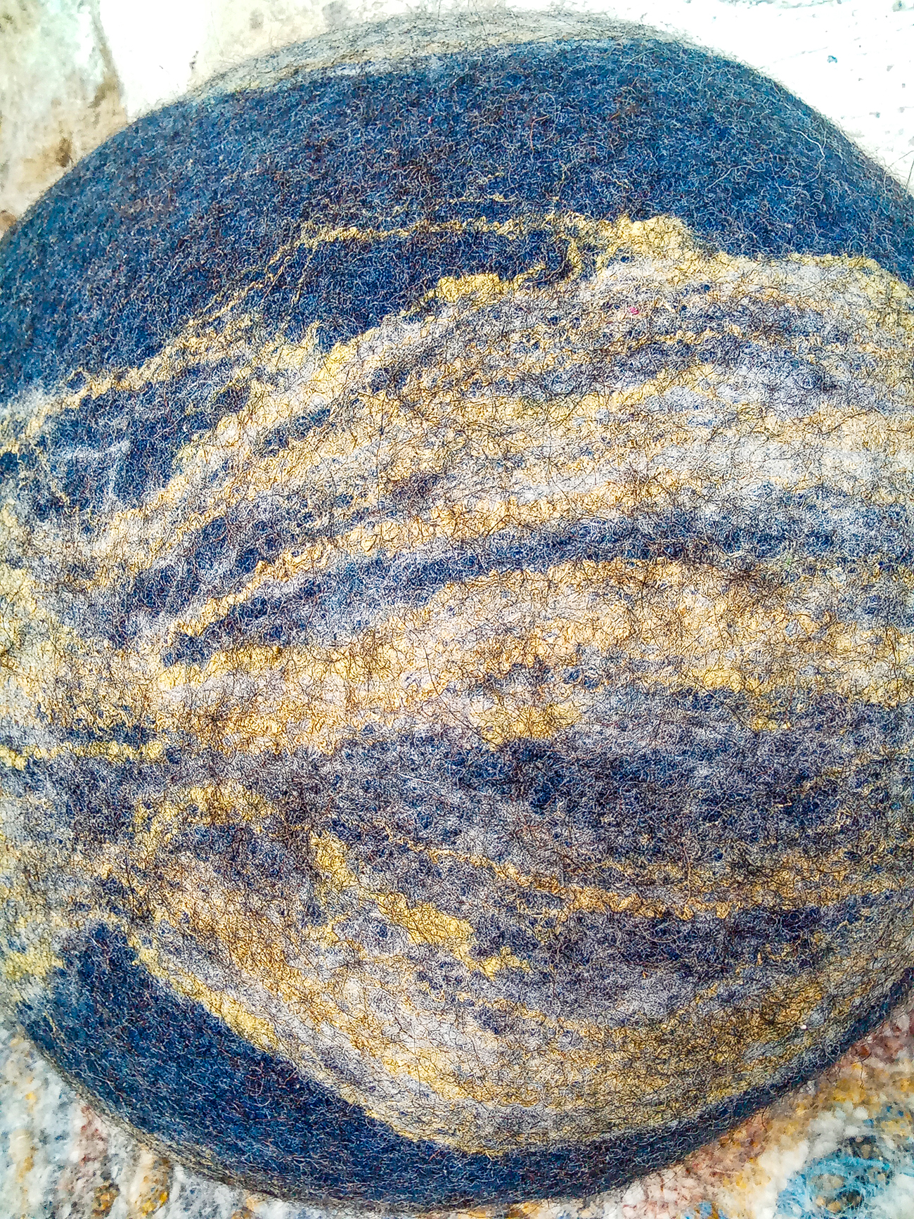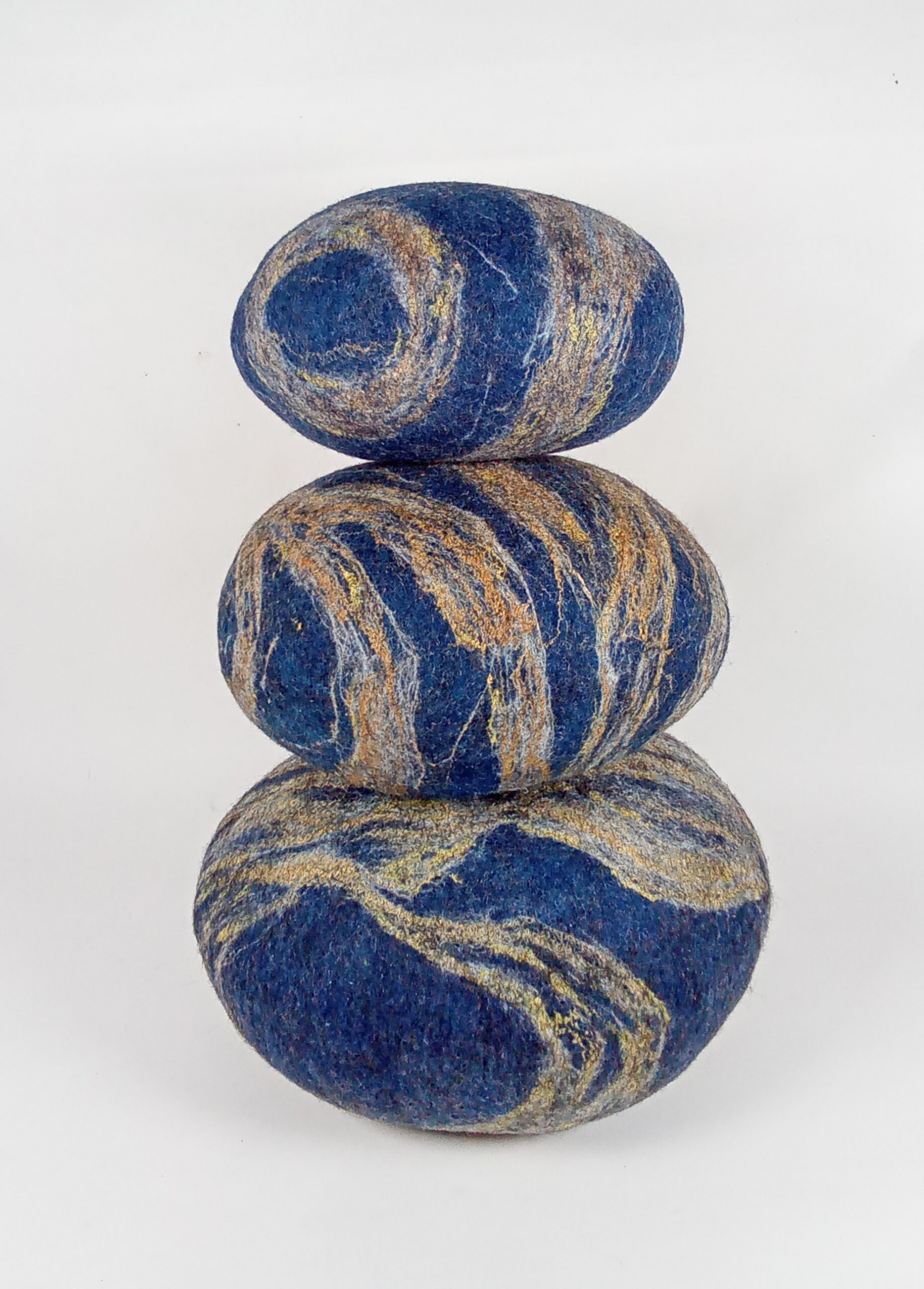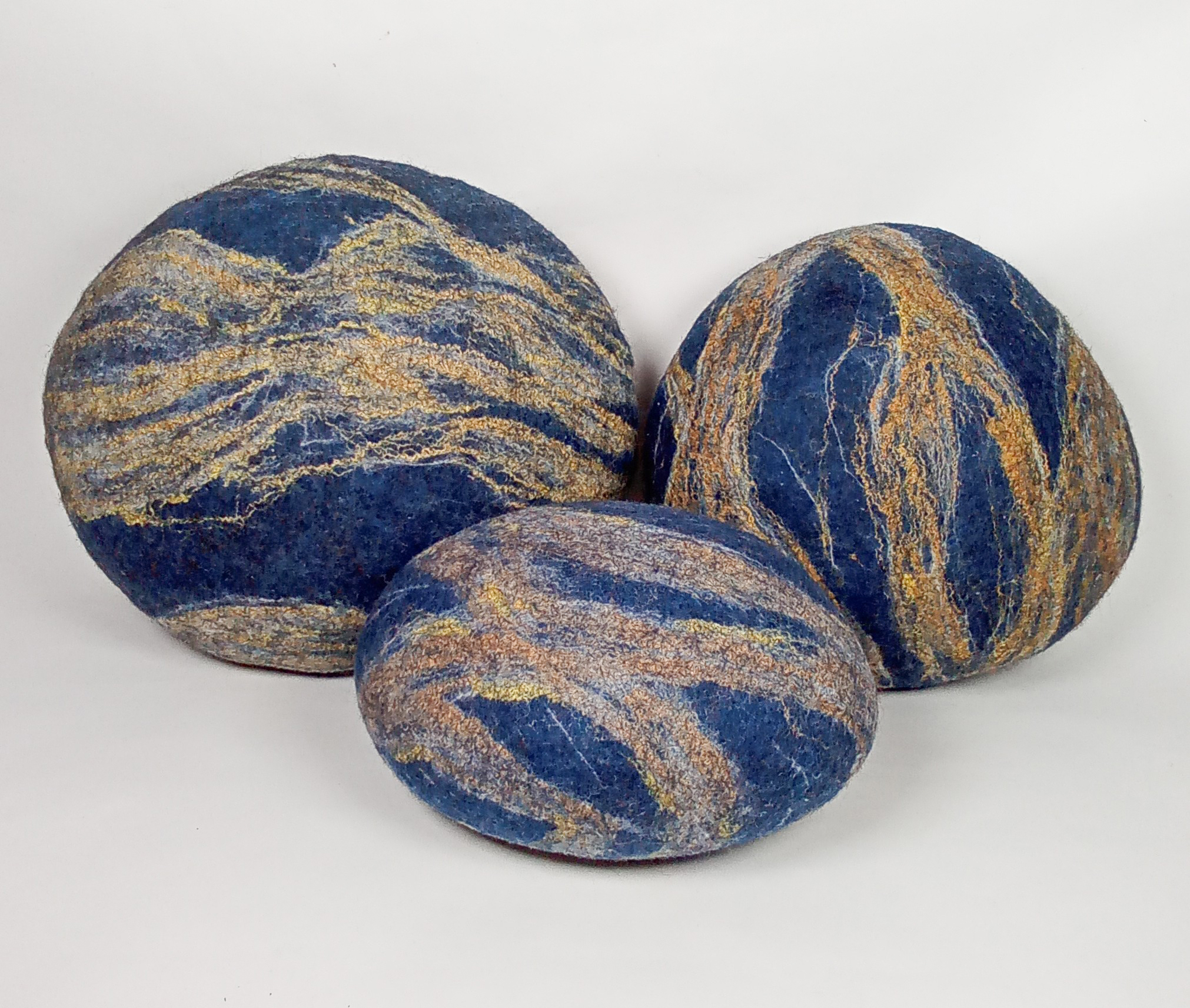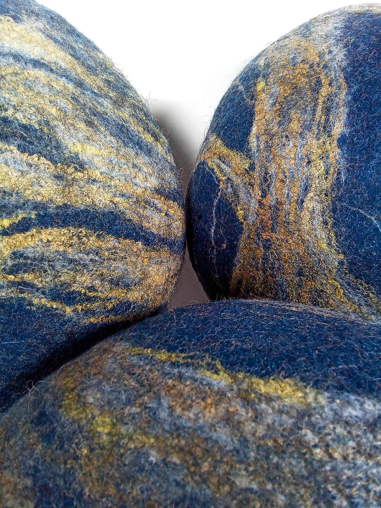 Voici un petit coussin décoratif en feutre de laine de Mérinos,en forme de galet, aux coloris bleu indigo et mordoré. Les motifs de volutes marbrées ont été réalisés grâce à de la laine de Mérinos : cette laine fine et douce a été teinte avec de l’indigo naturel. Elle est rehaussée de fibres de soie mordorées qui parcourent élégamment toute sa surface, comme des veines qui parcourent les galets. Chaque coussin est unique, avec son décor et sa forme propres.