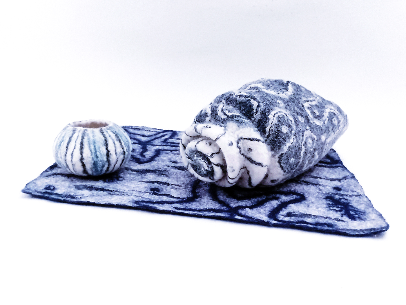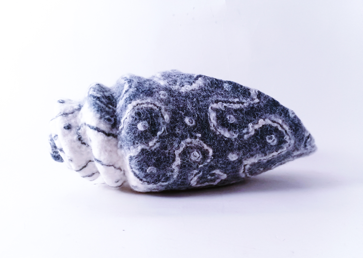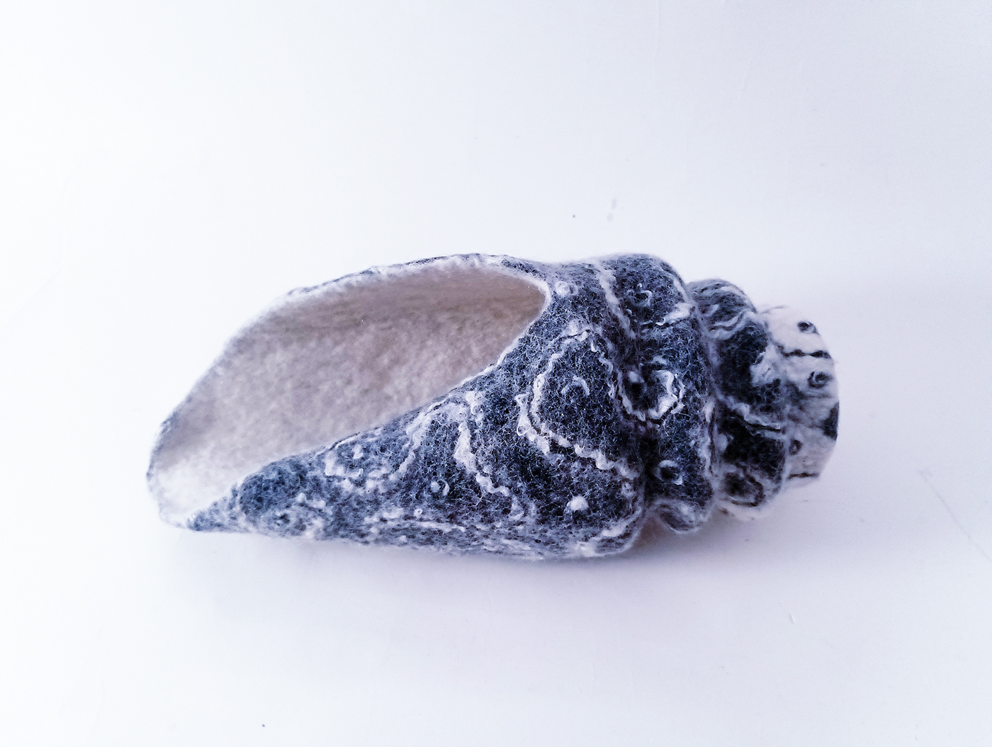 Voici une sculpture représentant un grand coquillage « cône » en feutre de laine indigo et écru, issu de la série des coquillages aux textures et motifs originaux inspirés du règne animal des fonds marins. Il est réalisé en feutre de laine écru teint à l’indigo naturel. Son décor de lignes ondulantes est texturé grâce aux fibres de soie incrustées dans la matière, qui donnent un toucher et relief uniques. L’intérieur est en feutre écru.
