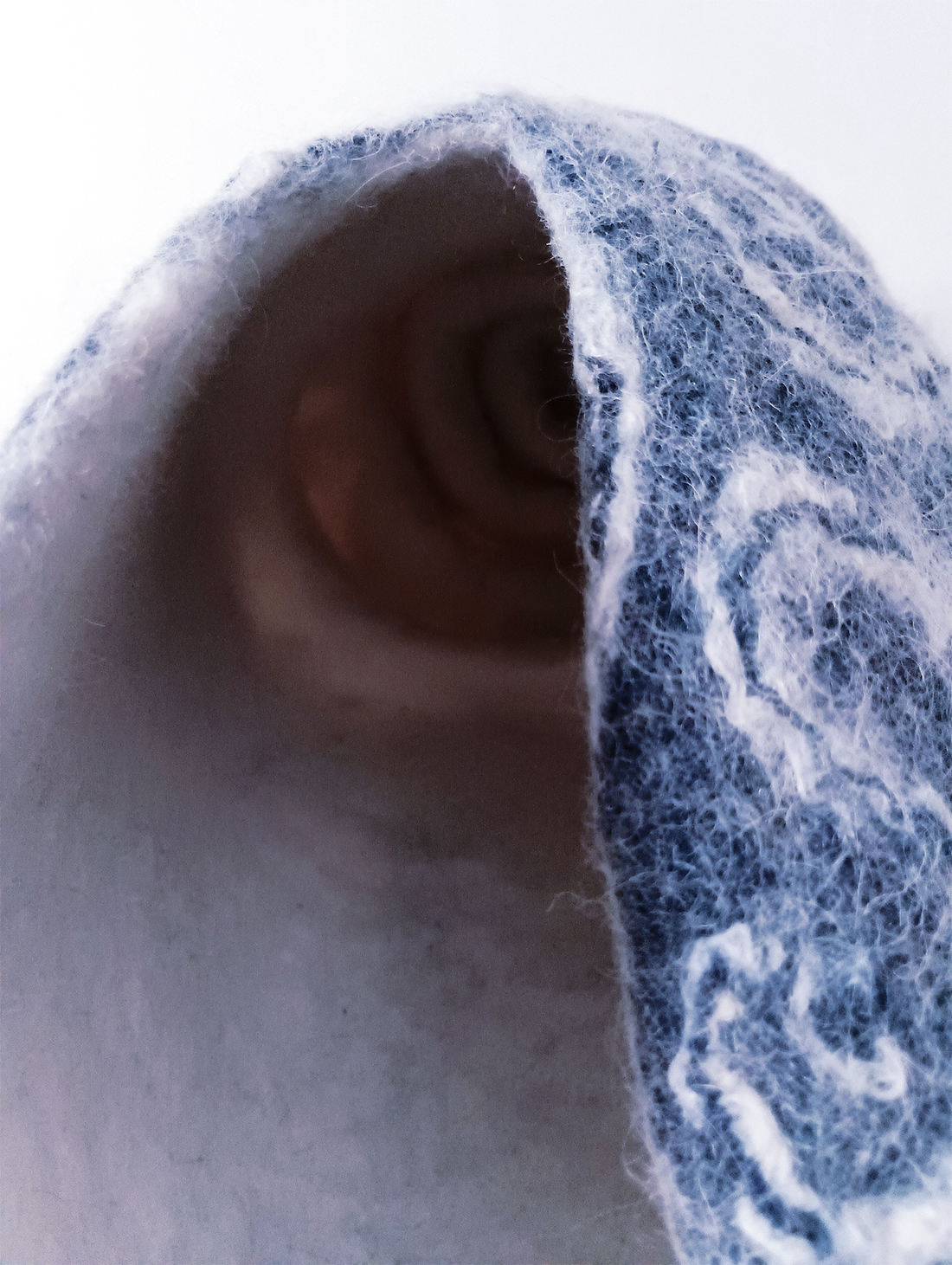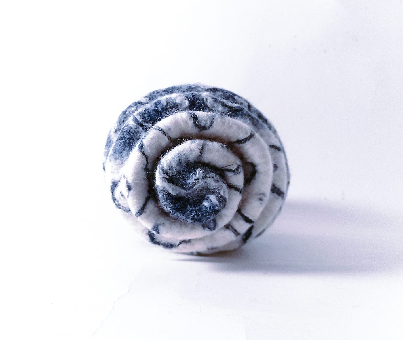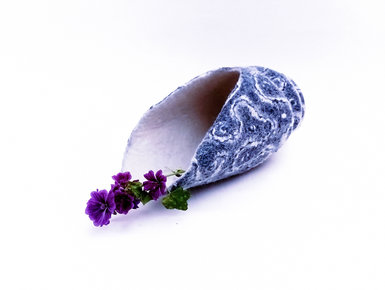 Voici une sculpture représentant un grand coquillage « cône » en feutre de laine indigo et écru, issu de la série des coquillages aux textures et motifs originaux inspirés du règne animal des fonds marins. Il est réalisé en feutre de laine écru teint à l’indigo naturel. Son décor de lignes ondulantes est texturé grâce aux fibres de soie incrustées dans la matière, qui donnent un toucher et relief uniques. L’intérieur est en feutre écru.