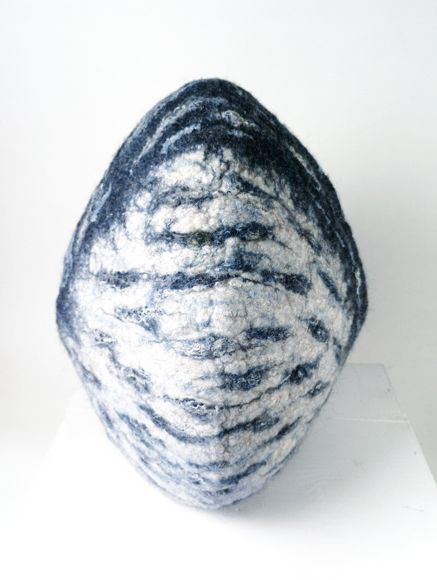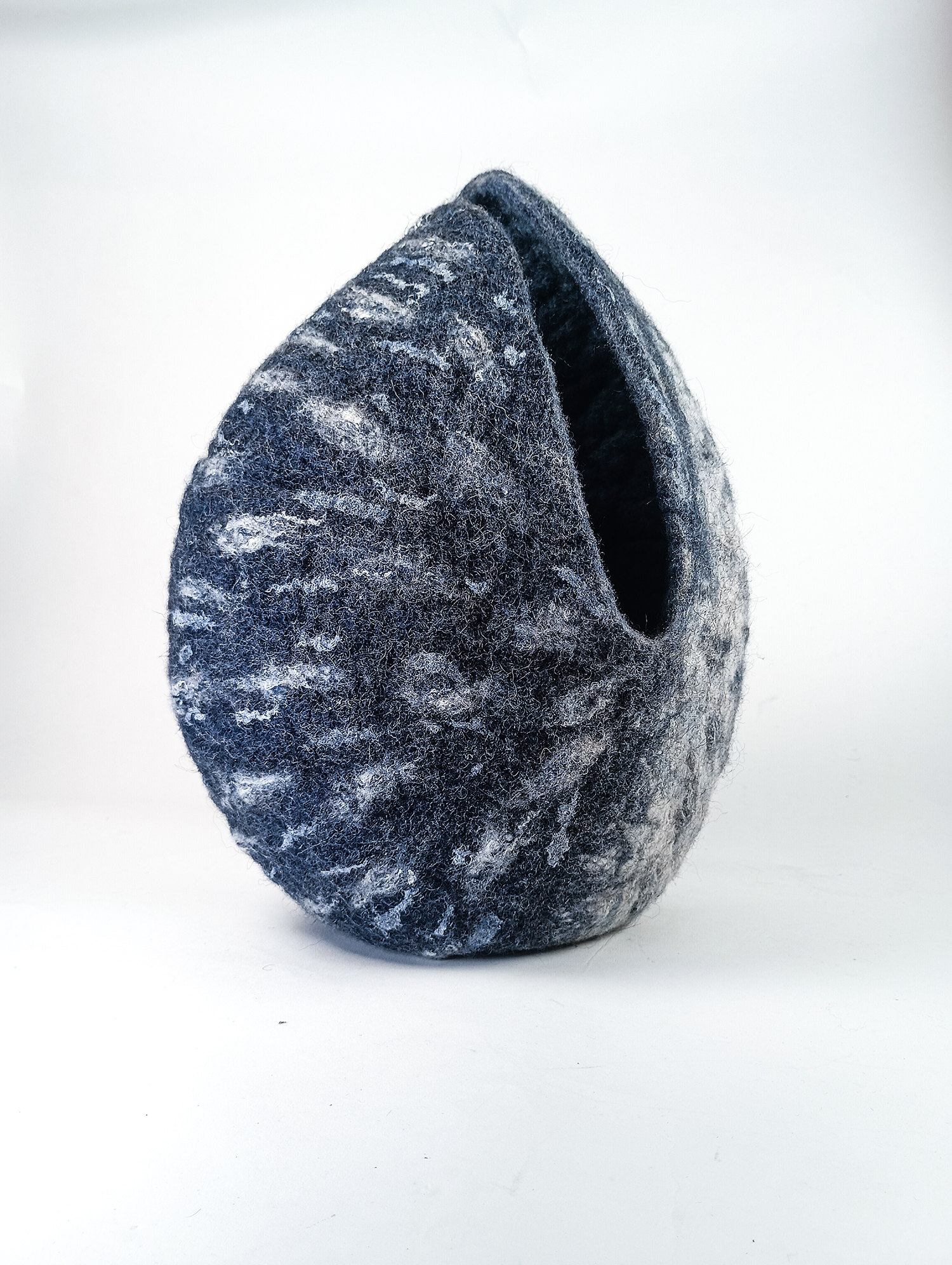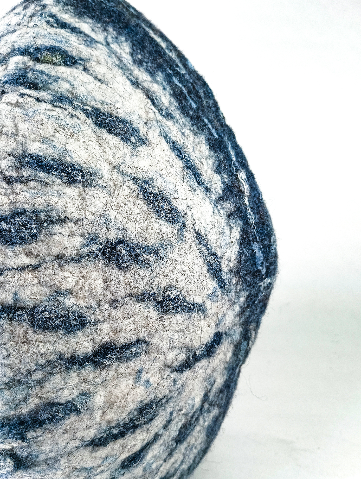 Voici une sculpture Nautile en feutre de laine Bleu indigo et écru, issu de la série d’objets aux textures et motifs originaux inspirés du règne animal des fonds marins. Il est en feutre de laine écru avec un décor dégradé en feutre de laine teint à l’indigo naturel et des fibres de soie incrustées dans la matière. L’intérieur est en feutre bleu indigo profond.